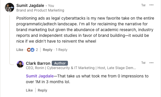 In response to my comment wishing we didn’t have to reinvent the wheel on brand marketing, Clark Barron stated that his quirky take on ads as “legal cyberattacks” helped him go from a 0 to a million impressions over a 3 month period. Entertaining takes on marketing usually catch my eye since it’s a profession that still requires creativity at its core no matter how much we strip all of it down to numbers.