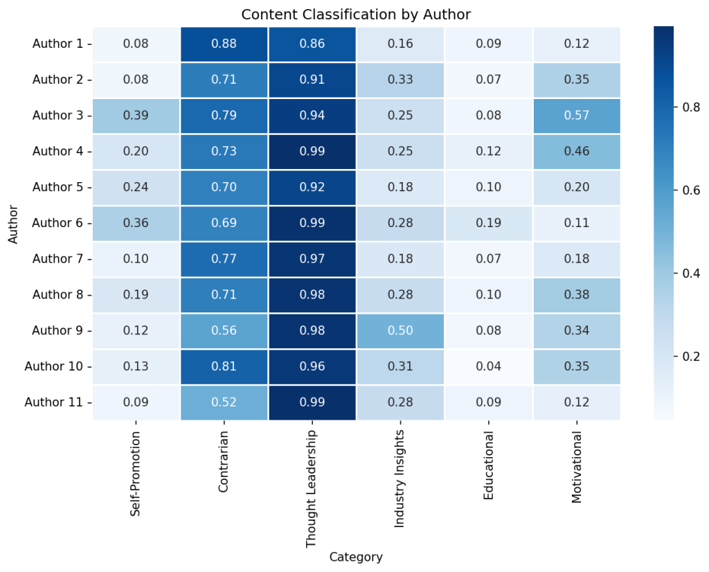 Recognizing that authors have diverse objectives—some to establish credibility, while others engage in audience discussions or challenge industry norms—ModernBERT quantified these tendencies effectively. The category scores provide a clear profile of each author’s content strategy, and a snapshot of the conversation around brand marketing on LinkedIn.