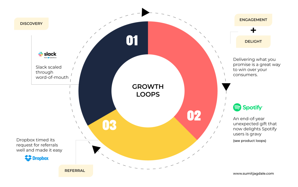 - These new referrals or repeat engagements feed back into the loop, bringing in more users and driving growth over time.